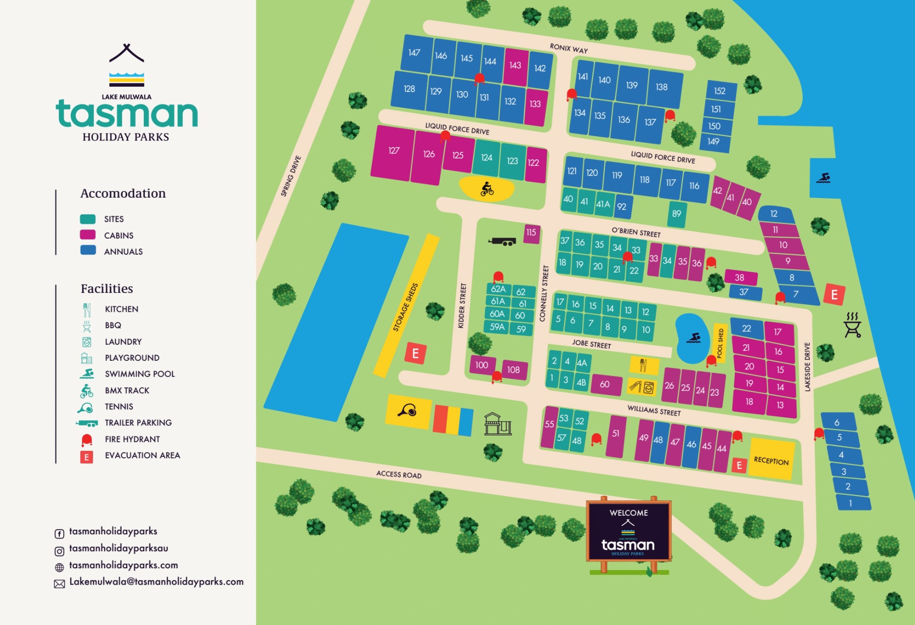 While the lake is the highlight, the park boast other impressive facilities which will suit the whole family. Let the kids go wild on the playground, swimming pool and bouncing pillow, make use of the pier for fishing or hire kayaks and pedal carts to add extra fun to the day. Other features include a new amenities block, boat ramp, fire drum hire, and a communal camp kitchen with pizza oven.