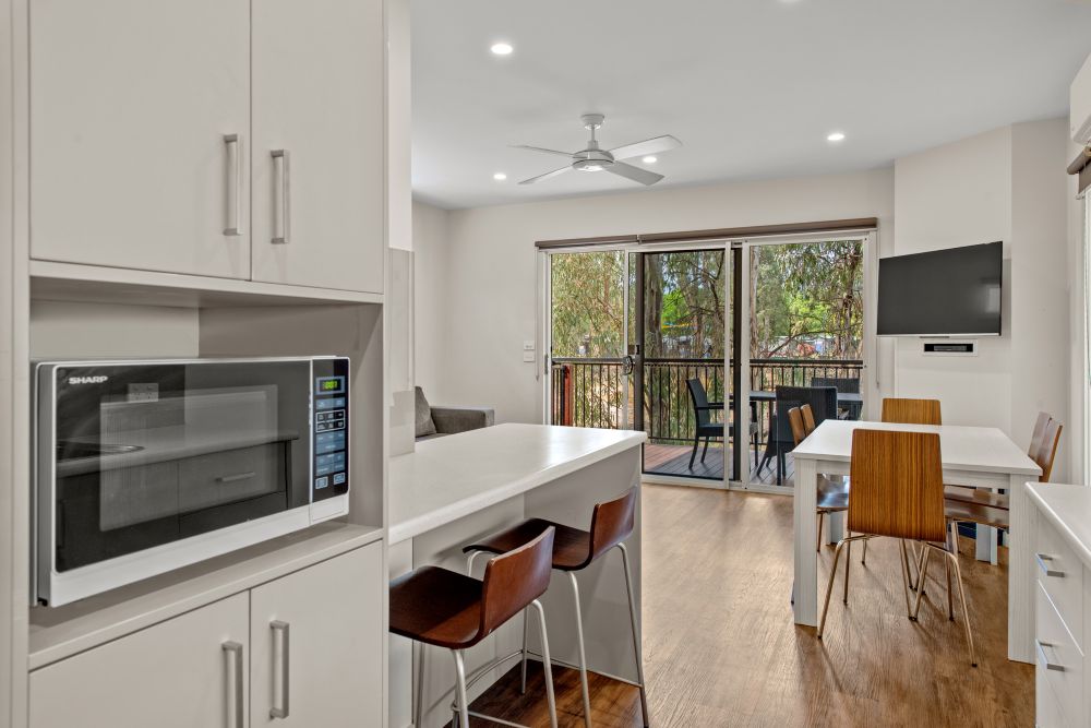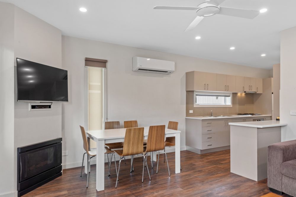 The Deluxe Cabin has three bedrooms with a lounge and dining area, ensuite and a full kitchen. Sleeps 7 (Maximum 7)