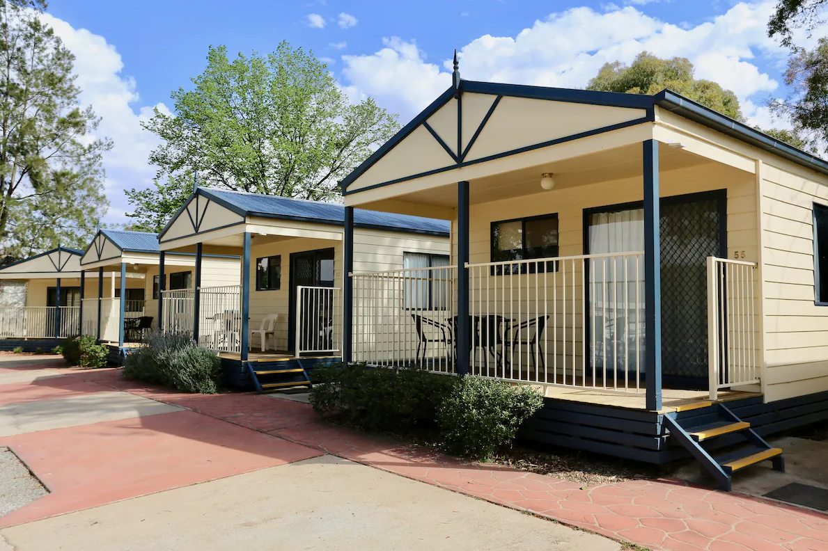 The park offers all the facilities you might need for a relaxing and comfortable stay.  It has a range of sizes of cabin to choose from including the Deluxe Holiday cabins, sleeping up to 5 people, or if you’re travelling in a group, there are several large cabins comfortably sleeping up to 8. For families, the Super Deluxe cabin is perfect, with separate bedrooms and bunk beds for the kids. Or you can choose the Standard cabin with triple bunks and modern ensuite bathroom, park does not supply cots or extra bed. For the budget conscious visitors, the non-ensuite cabins offer a comfortable stay with the pristine camp bathrooms just a short walk away. Please contact Young Tourist Park for any further information or extra requirements.