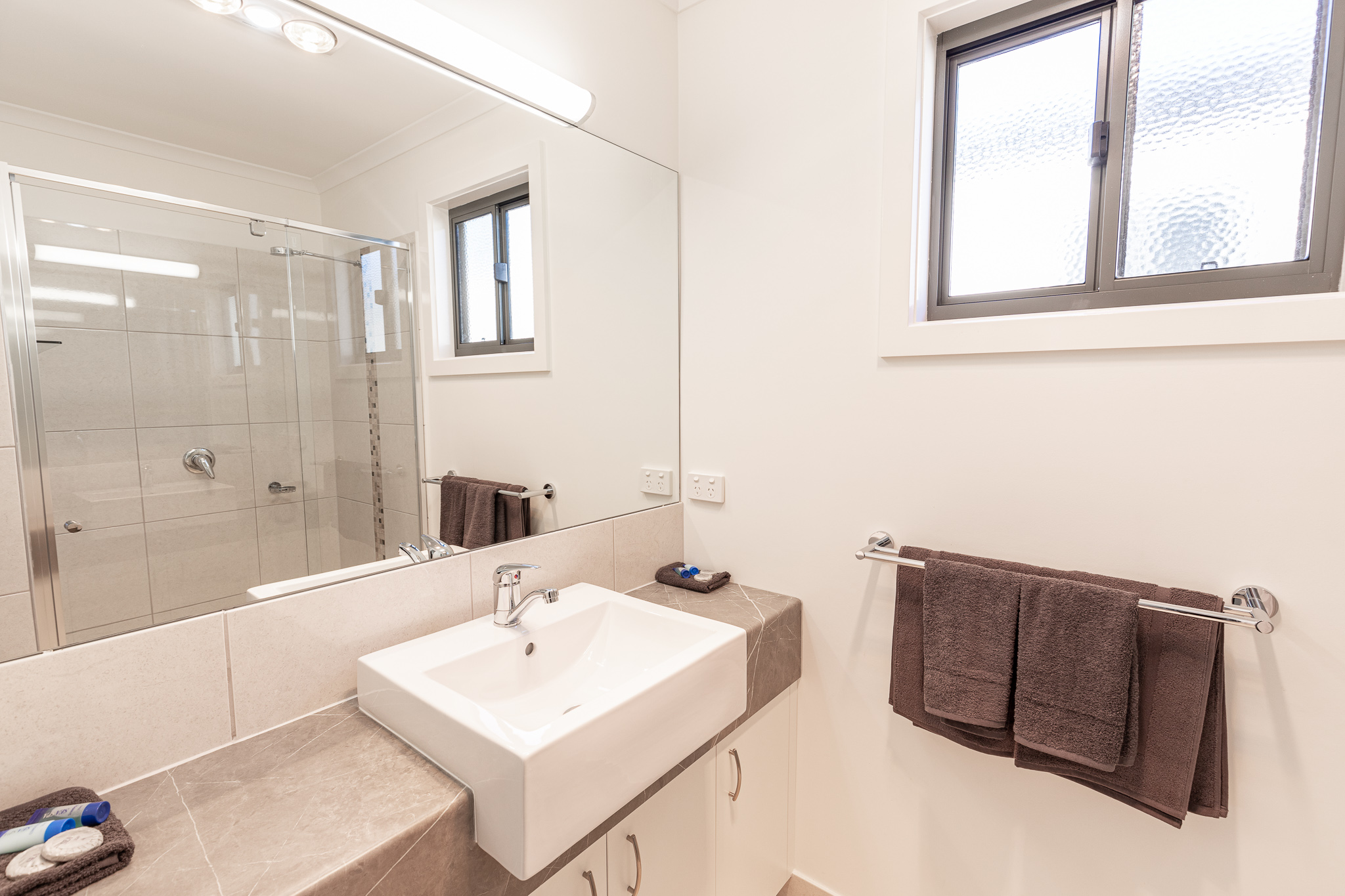 New, spacious, modern self contained 3 bedroom villas with front balconies and surrounding our outdoor solar heated swimming and BBQ area. The main bedroom has a queen bed with a pillow top mattress and the second and third bedroom both have a bunk - which is a double bed on the bottom and a single over the top. Kitchen with cooking facillities, including an espresso coffee machine, bathroom ensuite, lounge with tv & dvd, heating and air conditioning. Accommodates a maximum of 8 persons.