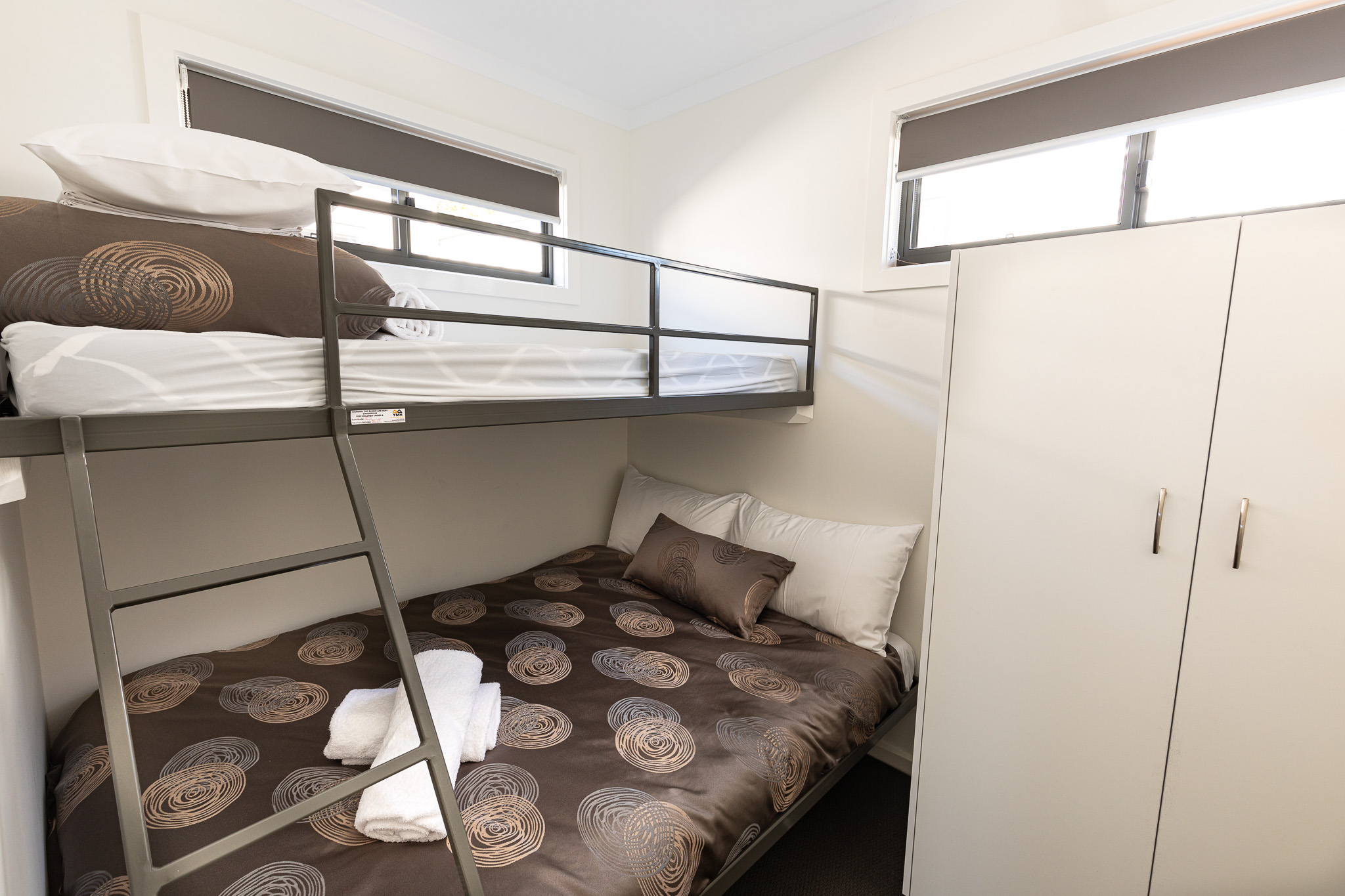New, spacious, modern self contained 3 bedroom villas with front balconies and surrounding our outdoor solar heated swimming and BBQ area.The main bedroom has a queen bed with a pillow top mattress and the second and third bedroom both have a bunk - which is a double bed on the bottom and a single over the top. Kitchen with cooking facillities, including an espresso coffee machine, bathroom ensuite, lounge with tv & dvd, heating and air conditioning. Accommodates a maximum of 8 persons.