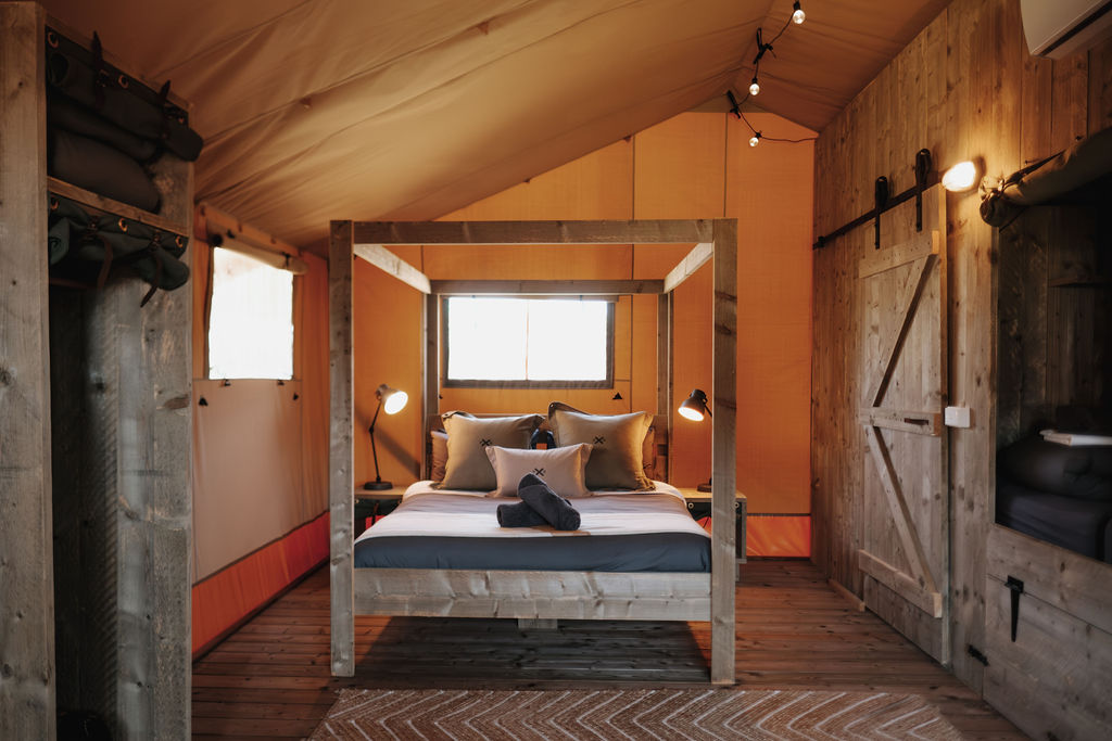 Our Brand new Safari Tents feature a main living area with a queen bed and a bed nook with 2 single beds. The couch can also fold down to a bed for an additional child if required. Fully equipped bathroom as well as a claw foot bath on the veranda. Kitchen has a large fridge & microwave, kettle & toaster, and there is a Weber BBQ on the veranda.